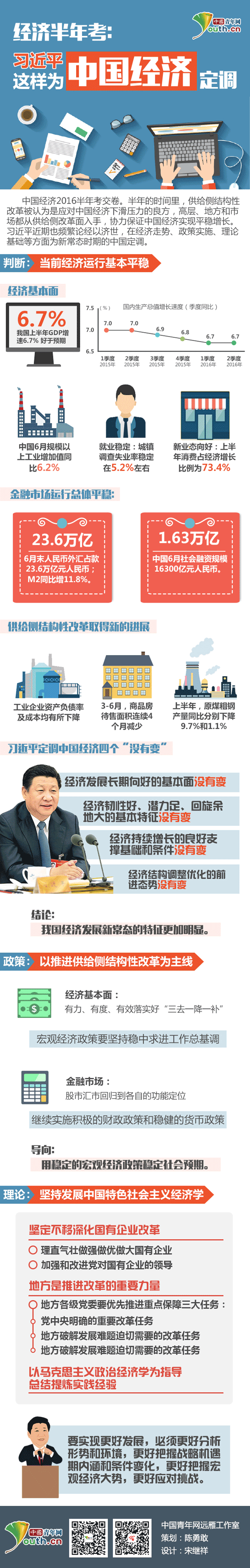 導(dǎo)語:2016年7月14日國家統(tǒng)計(jì)局公布中國經(jīng)濟(jì)半年數(shù)據(jù)。半年的時(shí)間里,供給側(cè)改革被認(rèn)為是應(yīng)對(duì)中國經(jīng)濟(jì)下滑壓力的良方。高層、地方和市場(chǎng)都從供給側(cè)改革面入手,協(xié)力共促中國經(jīng)濟(jì)實(shí)現(xiàn)平穩(wěn)快速增長。習(xí)近平主席近期也頻繁論述經(jīng)濟(jì),在經(jīng)濟(jì)走勢(shì)、政策實(shí)施、理論基礎(chǔ)等方面為新常態(tài)下的中國經(jīng)濟(jì)定調(diào)。