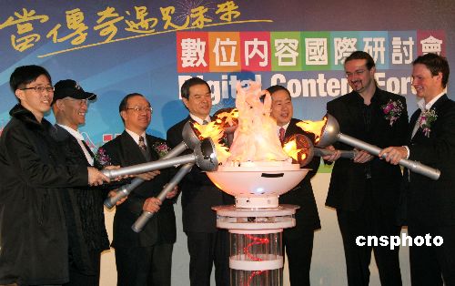一月二十四日,由臺(tái)北市電腦公會(huì)主辦的“二00八臺(tái)北國際電玩展”在臺(tái)北世貿(mào)一館開幕。展覽以“全家都是玩家”為主題,推出數(shù)字游戲、家用游戲機(jī)、游戲?qū)W校、玩具模型、動(dòng)漫畫等多種電玩產(chǎn)品。圖為主辦方在同期舉行的以“當(dāng)傳奇遇見未來”為主軸的“二00八數(shù)位內(nèi)容國際研討會(huì)”上,點(diǎn)燃象征臺(tái)灣數(shù)位內(nèi)容產(chǎn)業(yè)的圣火臺(tái)。 中新社發(fā) 孫自法 攝