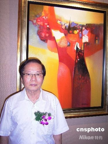 5月30日上午,瓊籍臺灣著名油畫家陳顯棟先生"八十回顧展"在海口開幕.圖為陳先生和最新創(chuàng)作的代表畫作合影。陳顯棟1930年生于海南,19歲赴臺,畢業(yè)于臺北復(fù)興崗學(xué)院藝術(shù)系。1961年參加“巴西圣保羅雙年展”,躋身臺灣畫家行列。兩年后“沉寂”,二十余年間,潛心研究媒材和技法,1985年以迥異于過往的畫風(fēng)復(fù)出。他的畫作多表現(xiàn)大自然,繽紛的色彩、創(chuàng)新的“畫膜”材質(zhì)和匠心獨(dú)具的構(gòu)圖,被稱為站在東西文化交匯點(diǎn)上的現(xiàn)代油畫家,表現(xiàn)出“具有人性親切感的詩象境界”。 中新社發(fā) 王辛莉 攝