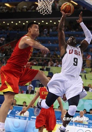 8月10日晚,北京奧運會男子籃球中國隊與美國“夢八隊”之戰(zhàn)在五棵松籃球館舉行,中國隊的超級中鋒姚明防守NBA球星韋德得上籃。 中新社發(fā) 任晨鳴 攝
