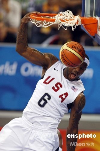 8月10日,奧運男子籃球比賽中國男籃與美國男籃的比賽在北京五棵松籃球館正式開打。圖為美國6號隊員詹姆斯扣籃。 中新社發(fā) 盛佳鵬 攝