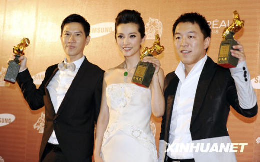11月28日,金馬獎(jiǎng)最佳女主角獎(jiǎng)獲得者李冰冰(中)和金馬獎(jiǎng)最佳男主角獎(jiǎng)獲得者張家輝(左)、黃渤合影。當(dāng)日,第46屆臺(tái)灣電影金馬獎(jiǎng)?lì)C獎(jiǎng)典禮在臺(tái)北舉行。新華社發(fā)(吳景騰 攝)