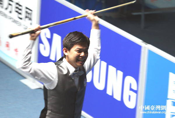 打入最后一顆花球后,郭柏成自信的指向球臺上的黑色八號球。(中國臺灣網 鐘寶華 攝)