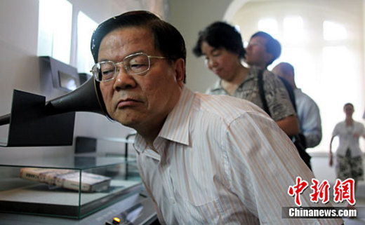 資料圖:2010年9月8日,中華文化聯誼會名譽會長蔡武在臺南市訪問臺灣文學館。圖為蔡武試聽以荷蘭語節錄的“熱蘭遮城日記”。中新社記者 劉舒凌 攝