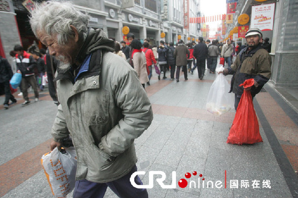 下午4點左右,記者來到上九路的金聲電影院門口,一個穿著藍色褲子的老人倚靠在影院門口,坐在地上忙著整理一堆橫七豎八的空飲料瓶。老人的白發和胡子非常凌亂,身上的衣物也臟兮兮的。經過交流,記者發現老人的聽力有問題,必須大聲喊著才能聽得到。