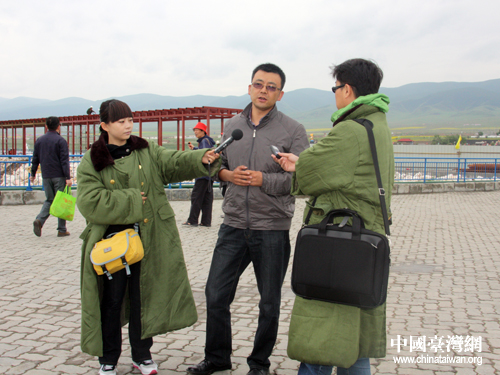 青海湖景區旅游管理處工作人員向兩岸記者介紹青海湖概況。兩岸媒體記者穿著租來的軍大衣,仍阻擋不了青海湖襲來的陣陣涼風。(中國臺灣網 楊云濤攝)