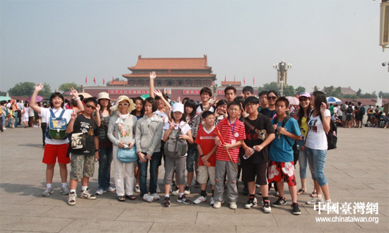 雖然正值三伏暑熱,來到天安門廣場的同學們卻都很興奮?吹秸把雒飨年犖槿绱撕甏螅顫姷呐_灣女生不禁感嘆:“哇,比臺灣的偶像開演唱會的人還要多耶”,引得大家一陣歡笑。同學們爭先恐后的拍照,并不時驚呼:“哇!我來過天安門了耶!”隨行的臺灣老師康春菊表示,“只有在課本、電視上才能看到的天安門真實的出現在眼前,只能用‘感動’來形容”。