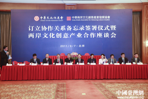 中國臺灣網9月7日北京消息 今日,中華文化促進會(以下簡稱“文促會”)與來自臺灣的中華兩岸文化創意發展協會(以下簡稱“文創會”)在京舉行了訂立協作關系備忘錄簽署儀式,并就兩岸文化創意產業合作展開座談。