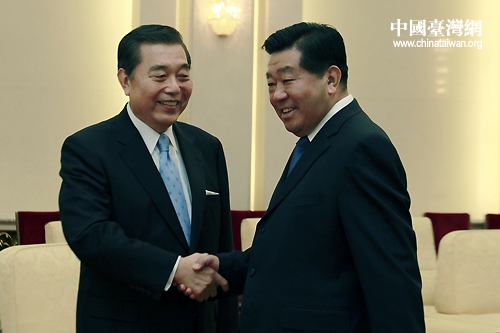 中共中央政治局常委、全國政協主席賈慶林與臺灣世貿中心董事長王志剛親切握手。(中國臺灣網 陳佳慧 攝)