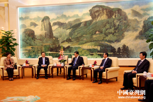 中共中央政治局常委、全國政協主席賈慶林在人民大會堂福建廳會見來京參加第十四屆京臺科技論壇的臺灣工商界代表。(中國臺灣網 張曉靜 攝)