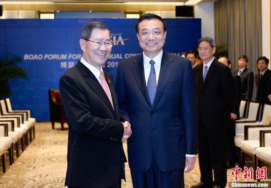 中共中央政治局常委、國務(wù)院總理李克強(qiáng)10日下午在海南省博鰲會見了前來出席博鰲亞洲論壇2014年年會的臺灣兩岸共同市場基金會榮譽董事長蕭萬長一行。(來源:中新網(wǎng) 劉震 攝)