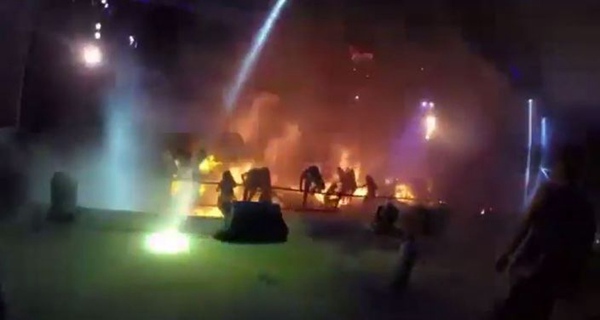 臺下民眾見到火舌后觀眾急忙逃走,舞臺上的工作人員最初嚇呆了,未有作出反應。過了不久,工作人員用滅火筒救火,怎料反而令粉塵飛揚,火勢愈來愈大。許多人實時全身著火,痛苦地在地上打滾,四處逃竄。