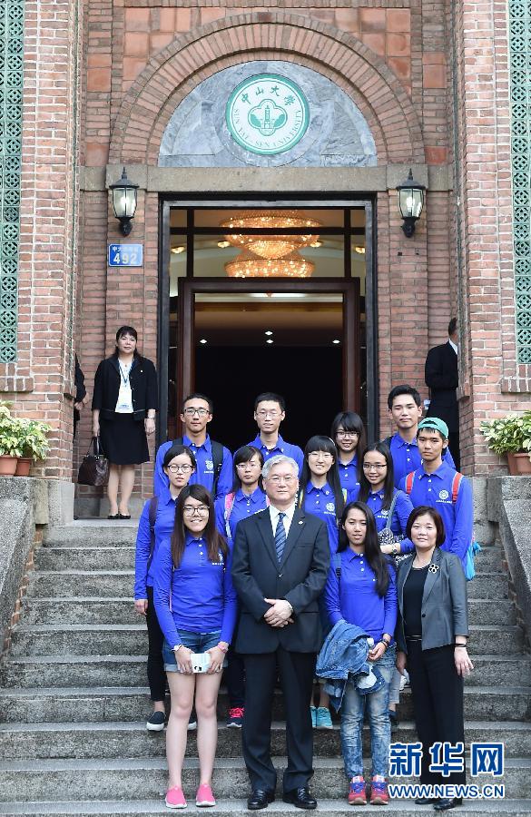 10月14日,夏立言在中山大學懷士堂前和學生合影。 10月14日,臺灣方面陸委會主委夏立言在廣州拜謁黃花崗七十二烈士墓,參觀孫中山大元帥府紀念館、中山大學,參訪廣州臺資企業(yè)。 新華社記者陳曄華 攝