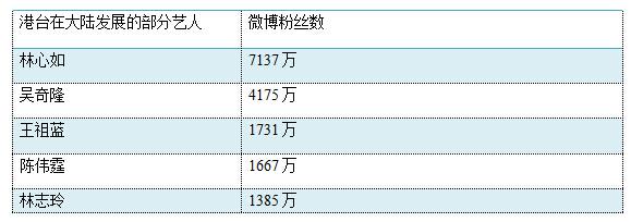 港臺在大陸發(fā)展的部分藝人新浪微博粉絲數(shù)統(tǒng)計(jì)