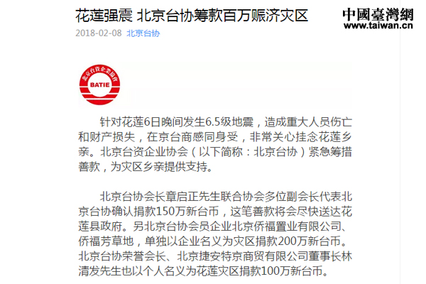 “花蓮6日晚間發(fā)生6.5級(jí)地震,造成重大人員傷亡和財(cái)產(chǎn)損失,在京臺(tái)商感同身受,非常關(guān)心掛念花蓮鄉(xiāng)親。”北京臺(tái)資企業(yè)協(xié)會(huì)(以下簡(jiǎn)稱“北京臺(tái)協(xié)”)8日在微信公眾號(hào)上宣布,北京臺(tái)協(xié)會(huì)長(zhǎng)章啟正先生聯(lián)合協(xié)會(huì)多位副會(huì)長(zhǎng)代表北京臺(tái)協(xié)確認(rèn)捐款150萬(wàn)新臺(tái)幣,這筆善款將會(huì)盡快送達(dá)花蓮縣政府。另北京臺(tái)協(xié)會(huì)員企業(yè)北京僑福置業(yè)有限公司、僑福芳草地,單獨(dú)以企業(yè)名義為災(zāi)區(qū)捐款200萬(wàn)新臺(tái)幣。北京臺(tái)協(xié)榮譽(yù)會(huì)長(zhǎng)、北京捷安特京商貿(mào)有限公司董事長(zhǎng)林清發(fā)先生也以個(gè)人名義為花蓮災(zāi)區(qū)捐款100萬(wàn)新臺(tái)幣。