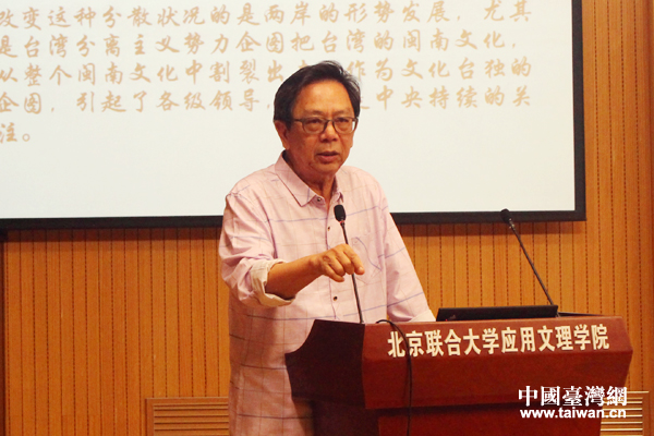 福建省廈門市閩南文化研究會會長陳耕圍繞“閩南文化研究新世紀的回顧與新時代的前瞻”進行主題發言。(中國臺灣網 張潔 攝)