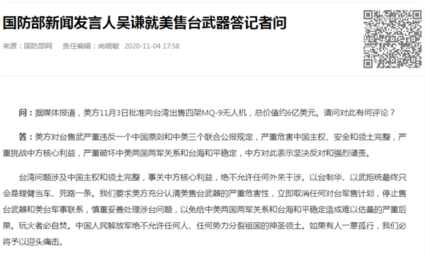 中國臺灣網11月5日訊 國防部新聞發言人吳謙4日就美售臺武器答記者問。針對有記者問:據媒體報道,美方11月3日批準向臺灣出售四架MQ-9無人機,總價值約6億美元。請問對此有何評論?