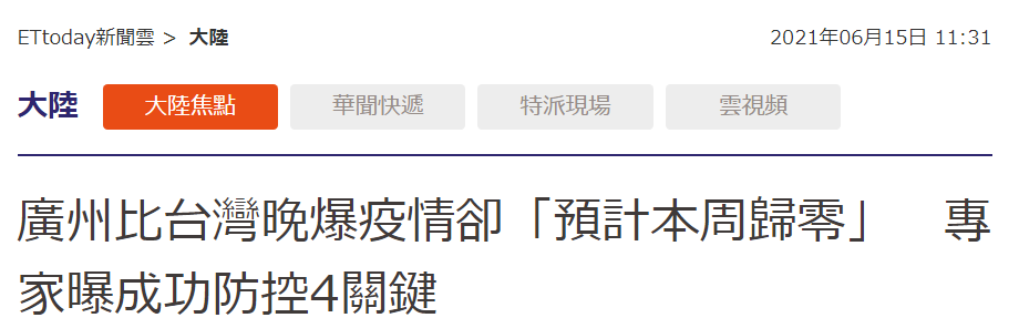 臺灣“ETtoday新聞云注意到,廣州比臺灣晚暴發(fā)疫情,但可望在本月20日前清零。至于原因,報道提到了廣東省疾控中心首席專家馬文軍講到的廣州成功防控的關(guān)鍵。