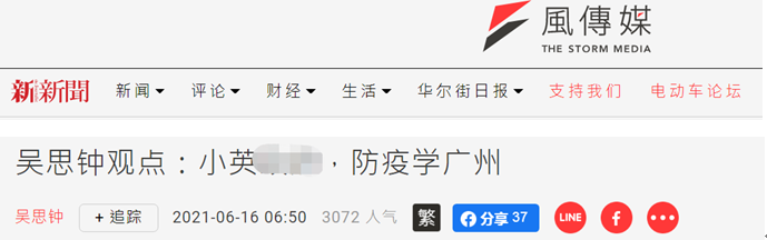 吳思鐘在文章中說:“如果沒有廣州比較,指揮中心仍以為大權(quán)在握,而人民無知,其可以一意孤行,阻攔普篩及疫苗捐贈,坐視臺灣人民染疫而寃死。我甚盼小英‘政府’,防疫學(xué)廣州;臺灣人命,勝過一切。”