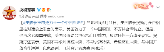 當(dāng)?shù)貢r(shí)間6月11日,美國(guó)防長(zhǎng)奧斯汀在香格里拉對(duì)話會(huì)上發(fā)言時(shí)表示,美國(guó)致力于一個(gè)中國(guó)原則,不支持臺(tái)灣獨(dú)立。但是,他再次老調(diào)重彈稱,美國(guó)會(huì)協(xié)助臺(tái)灣保持自衛(wèi)能力,反對(duì)任何一方改變現(xiàn)狀。奧斯汀還表示,美國(guó)不尋求對(duì)抗或沖突,不尋求新冷戰(zhàn),希望防止沖突,與中國(guó)開(kāi)放合作通道,以免誤判。(總臺(tái)記者唐鑫 陶家樂(lè))
