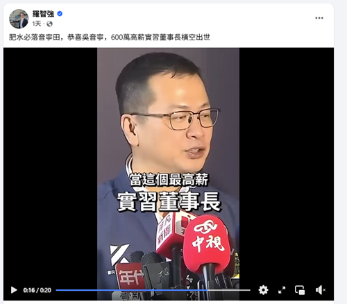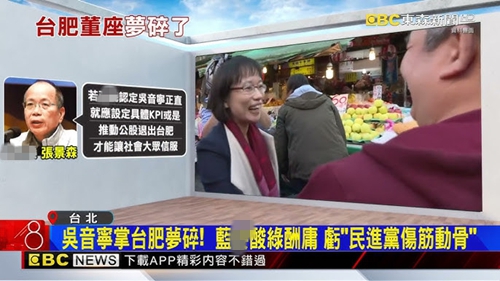 國民黨民代柯志恩批評,賴當局的人事酬庸再創驚奇,吳音寧若真的“飛上枝頭”出任臺肥董事長,無異是堂而皇之地宣告“無需專業、黨證無敵”,民進黨的“肥水盡落自家田”赤裸登場。