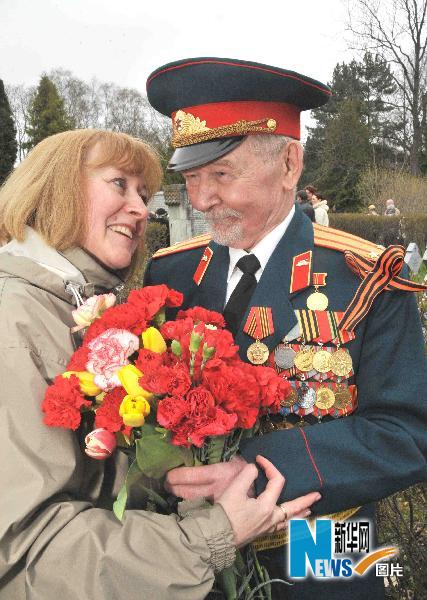 5月9日,在愛沙尼亞首都塔林,一名參加二戰(zhàn)的老戰(zhàn)士接受人們的祝福。當(dāng)天,愛沙尼亞舉行各種活動,慶祝世界反法西斯戰(zhàn)爭勝利65周年。新華社發(fā)(維克托攝)