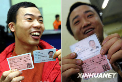 1月21日,外來務工人員李建剛(右圖)和他表弟劉超(左圖)通過電話訂票買到廣州至資陽的實名制火車票。(圖片來源:新華社 劉大偉 攝)