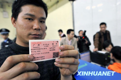 1月21日,一名旅客在廣州流花展館展示自己當天早上通過電話訂到的廣州至鄭州的實名制火車票。(圖片來源:新華社 劉大偉 攝)