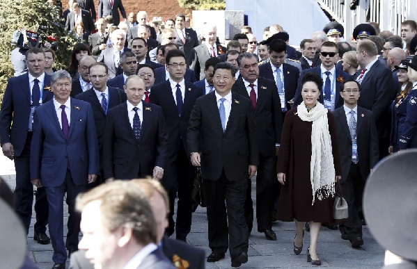 9日一早,普京在克里姆林宮迎候了約20個(gè)國(guó)家和地區(qū)及國(guó)際組織的領(lǐng)導(dǎo)人,習(xí)主席和夫人彭麗媛是最后抵達(dá)的貴賓。外交禮儀中,顯而易見(jiàn),“壓軸出場(chǎng)”的客人當(dāng)然是最重要的客人啦。