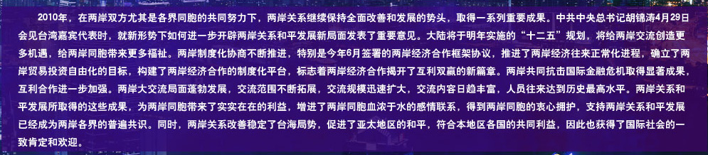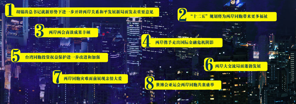 胡錦濤總書記就新形勢下進一步開辟兩岸關系和平發展新局面發布重要意見 “十二五”規劃將為兩岸同胞帶來更多福祉 兩岸兩會商談成果豐碩 兩岸攜手走出國際金融危機陰影 臺灣同胞投資權益保護進一步改進和加強 兩岸大交流局面蓬勃發展 兩岸同胞災難面前展現親情大愛 世博會亞運會兩岸同胞共襄盛舉