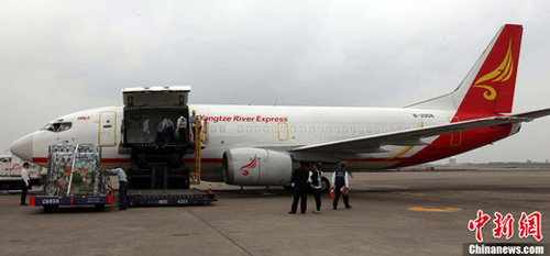 4月16日上午10點05分,運送臺灣梅花鹿繁星、點點和長鬃山羊喜洋洋、樂洋洋的貨機揚子江B-2908在臺北桃園機場裝機起飛。預計將于下午一點抵達山東威海安家定居,在山東經過一個月的隔離檢疫期后,將和廣大游客見面。中新社發 沈存旭 攝