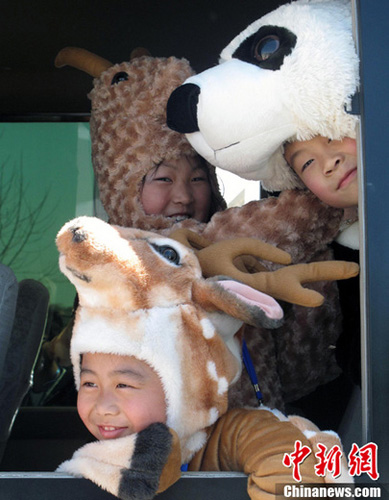 16日上午,威海小朋友來到當地機場迎候臺灣梅花鹿和長鬃山羊,她們將穿著羊與鹿以及大熊貓樣式的服裝表演舞蹈。這三種珍貴的動物今起將一同生活在劉公島國家森林公園。劉舒凌 攝
