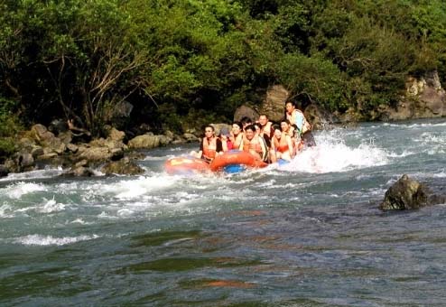 臨近終點(diǎn)時(shí),我們的船槳才完完全全地派上了用場(chǎng),這里水流平緩,船在水中徘徊不前,不得不齊心合力地劃動(dòng)著槳。此時(shí),樂趣來(lái)自于與同行船之間的“打水仗”,渾身濕透的我們毫不顧忌地將水潑向?qū)Ψ剑宦窔g聲笑語(yǔ),令人回味無(wú)窮。全程3小時(shí)的漂流之旅,不僅是運(yùn)動(dòng)之旅,觀景之旅,還是一次呼吸清新空氣的健康之旅。(謝向榮 特約記者 尹秋艷)