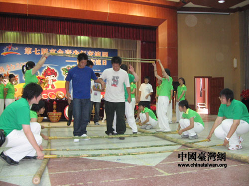 隨后豐臺(tái)二中表演了具有民族特色的跳竹竿節(jié)目,并邀請(qǐng)臺(tái)灣師生共同上臺(tái)表演。雖然之前沒(méi)有經(jīng)過(guò)訓(xùn)練,臺(tái)灣師生依然能有節(jié)奏地跟著跳動(dòng)。大家手牽手,玩得不亦樂(lè)乎。