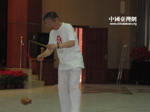 中國臺灣網7月13日北京消息 今天上午,臺灣鶯歌高職扯鈴隊參觀了北京市豐臺二中,并與二中的學生,分別進行了抖空竹表演。在演出現場,本網記者就兩岸空竹藝術的發展特色專訪了北京玩具協會空竹委員會副主任劉振鈺老先生。