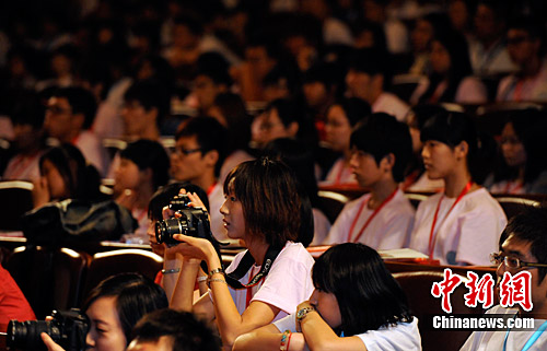 7月6日晚,全國臺聯“2010年臺胞青年千人夏令營”在北京京西賓館大禮堂開營。來自島內、海外的千余名臺胞青年匯聚于此,開啟暑期大陸之旅。圖為臺灣學生被精彩的表演吸引。中新社發 劉震 攝