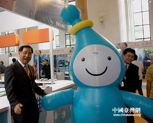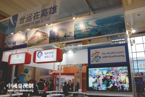 走進臺灣館,第一個看到的就是高雄市展臺。作為2009世界運動會主辦城市的高雄,今天特地來到北京參加國際旅游博覽會。高雄市政府觀光局局長林昆山還跟世運會吉祥物一道發出熱情的邀請:高雄熱忱友善地歡迎好朋友們到高雄來。