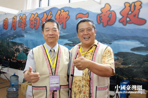 南投縣政府觀光處處長洪文能(左)和南投金都餐廳總經理王文正,向大陸同胞推介南投這個觀光旅游的好地方。(中國臺灣網記者 張弛 攝)