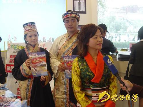 在大陸展區里,各省市代表團爭相凸顯各自的旅游特色,山光水色濃縮在展區當中,讓人目不暇接。圖為西藏旅游屆代表接受臺灣媒體采訪。