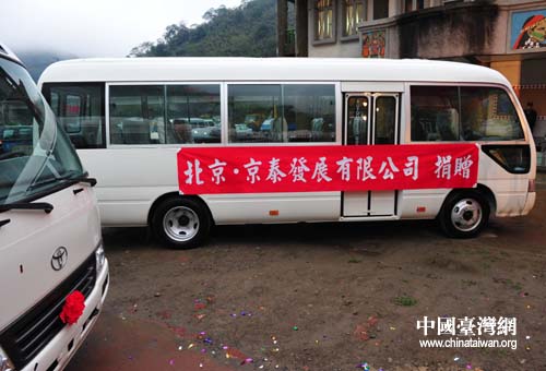 中國臺灣網12月20日臺中消息 日前,經臺灣“立委”高金素梅牽線,赴臺中參加第十三屆京臺科技論壇的北京市常務副市長吉林率京泰發展有限公司捐贈了2輛愛心中巴給臺灣少數民族鄉村──新竹縣尖石鄉、五峰鄉,作為鄉內居民、學童日常通勤之用。(中國臺灣網 吳捷)