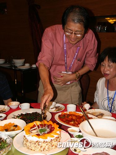 西部網(wǎng)訊 7月16日晚,參加“情系長安——兩岸文化聯(lián)誼行”大型活動(dòng)的臺灣中華文物保護(hù)協(xié)會理事長莊芳榮在觀看完華清池大型真山真水實(shí)景歷史舞劇后,在晚宴上收到一份驚喜。原來,7月16日是莊芳榮先生的六十三歲生日,作為活動(dòng)承辦方,陜西省臺灣事務(wù)辦公室的工作人員在晚宴為莊先生特意準(zhǔn)備了生日蛋糕,并號召現(xiàn)場所有嘉賓為莊先生唱起生日快樂歌。這個(gè)特別的安排讓莊先生倍感溫暖。莊先生告訴記者,自己非常感謝活動(dòng)組織方的細(xì)心和貼心,是他們讓自己在陜西度過的這個(gè)生日將變得非常難忘。