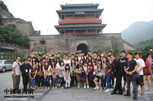 臺(tái)灣青年學(xué)生交流團(tuán)自8月8日起,開始了北京參訪之旅。圖為團(tuán)員們?cè)诰佑龟P(guān)長(zhǎng)城前合影留念(中國(guó)臺(tái)灣網(wǎng) 吳曉寒 攝)