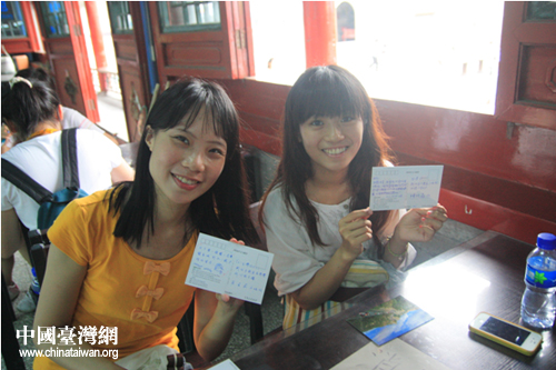 臺灣學(xué)生在長城腳下給家人郵寄明信片(中國臺灣網(wǎng) 吳曉寒 攝)