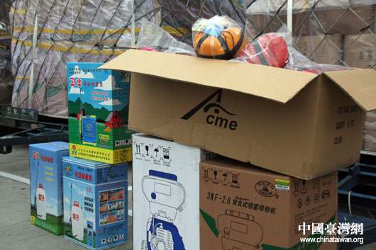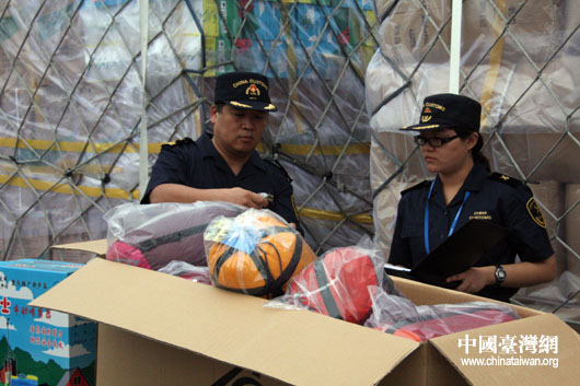 海關(guān)人士檢查即將啟運(yùn)的救災(zāi)物資。(中國臺灣網(wǎng) 鐘寶華 攝)