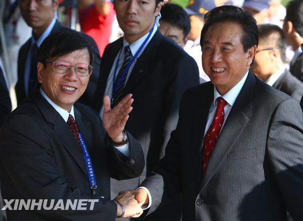 11月5日,陳云林(右)和新竹科學(xué)工業(yè)園區(qū)管理局局長顏?zhàn)诿魑帐帧.?dāng)日,海協(xié)會會長陳云林參觀新竹科學(xué)工業(yè)園區(qū)。新華社記者 邢廣利 攝