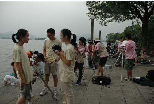 雖然杭州當天的云層較厚,讓日全食觀測顯得比較困難,但時隱時現的太陽卻為日全食觀測帶來了不斷的新鮮感,每一次太陽從云層中出來,都讓現場的師生雀躍不已,來自臺灣臺北天文館的專家還在現場講解了日全食的相關知識,并在現場以針孔觀測法、墨水盆觀測法等方式解說日全食的過程。