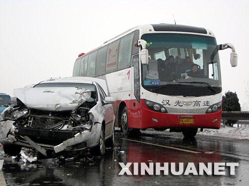 當日,湖北再降大雪,記者經漢宜高速公路前往江漢平原采訪雪情,沿途看到多起交通事故。新華社記者皮曙初攝