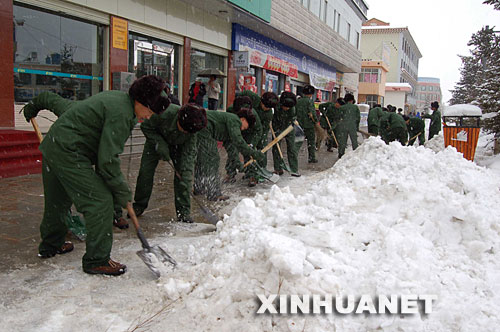 1月30日,武警官兵在云南迪慶藏族自治州香格里拉大街上鏟冰除雪。 新華社記者 蔡祥榮攝