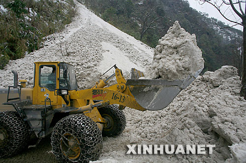 1月30日,搶險人員在云南貢山縣境內(nèi)清除路面積雪。 新華社記者 楊牧源攝