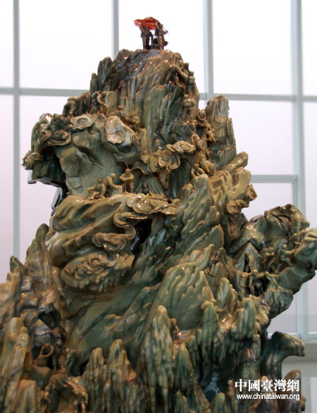 館內(nèi)展出的一尊完成于上世紀(jì)60年代、重2.5噸的珍貴“玉山子”,內(nèi)容為勇攀珠峰。(中國(guó)臺(tái)灣網(wǎng) 鐘寶華 攝)